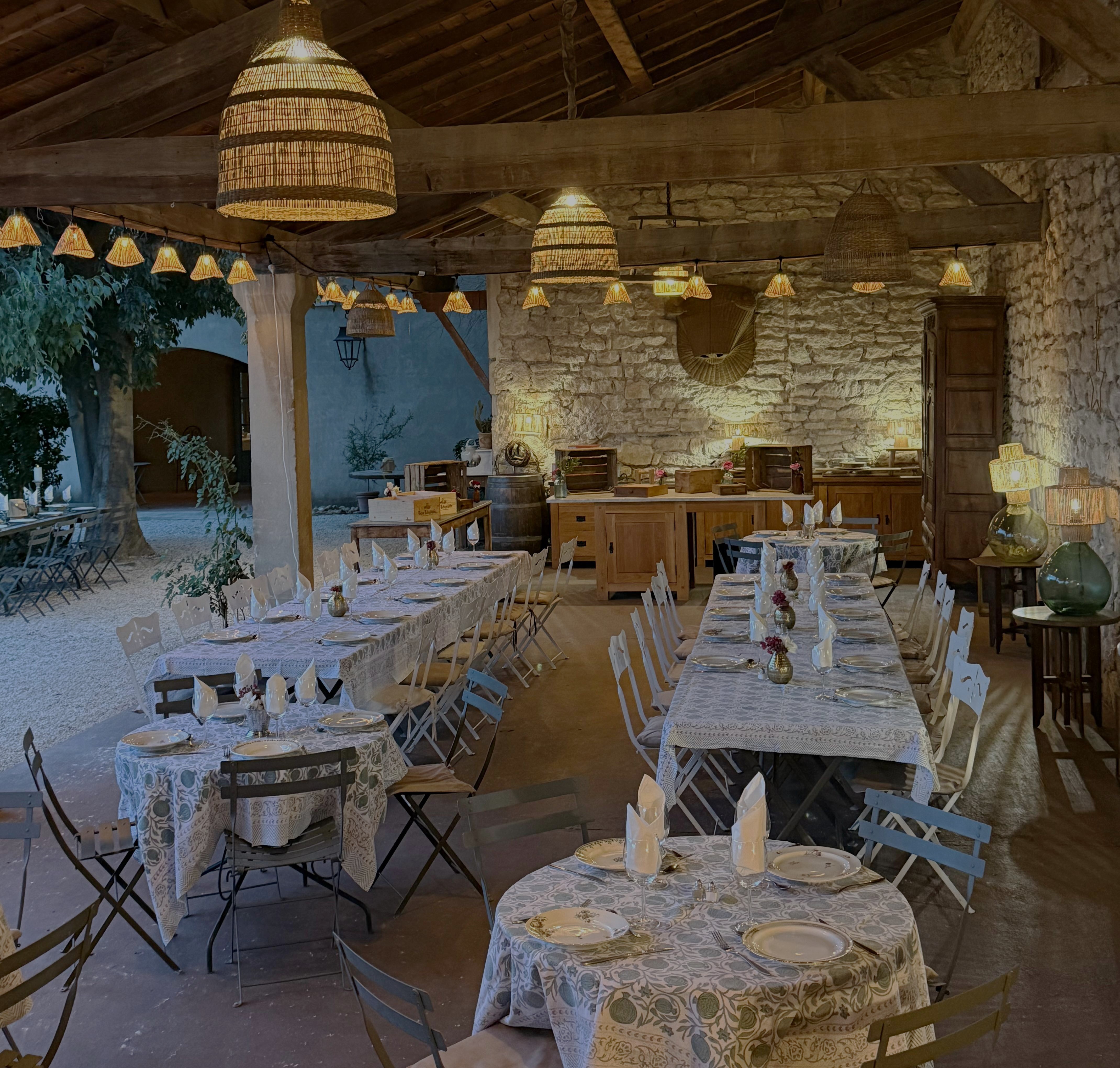 Le Domaine des Clos offers you a gourmet table to enjoy on the spot extending the comfort of your stay. Tables are set in the Écuries dining room or under the Auvent des Roses, with candlelight, garden flowers, shimmering tablecloths and ruby, straw or rosé Costières de Nîmes wines.